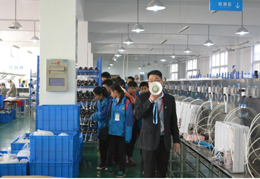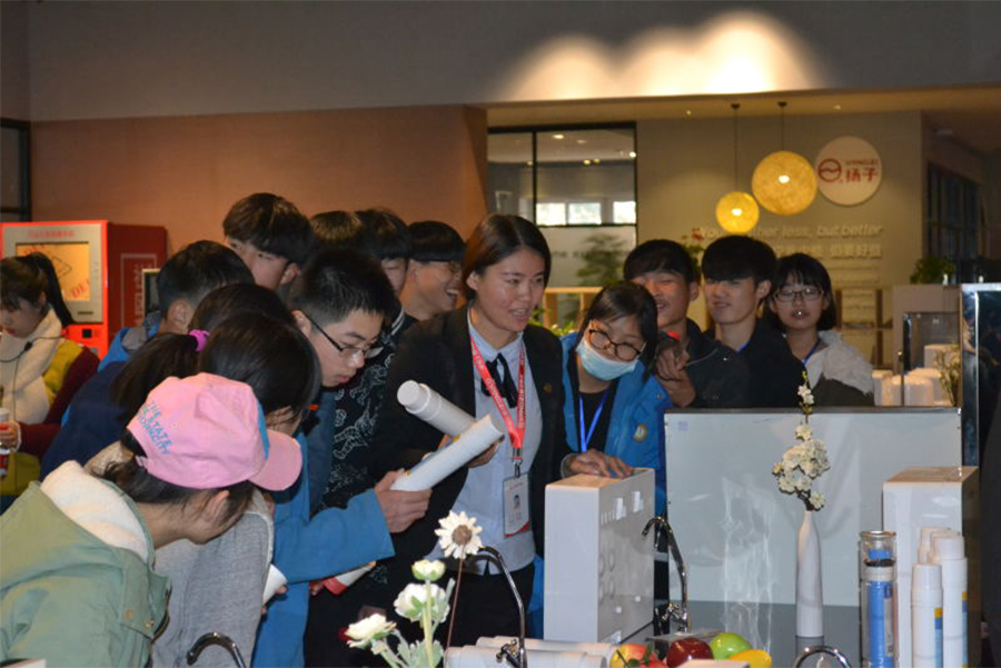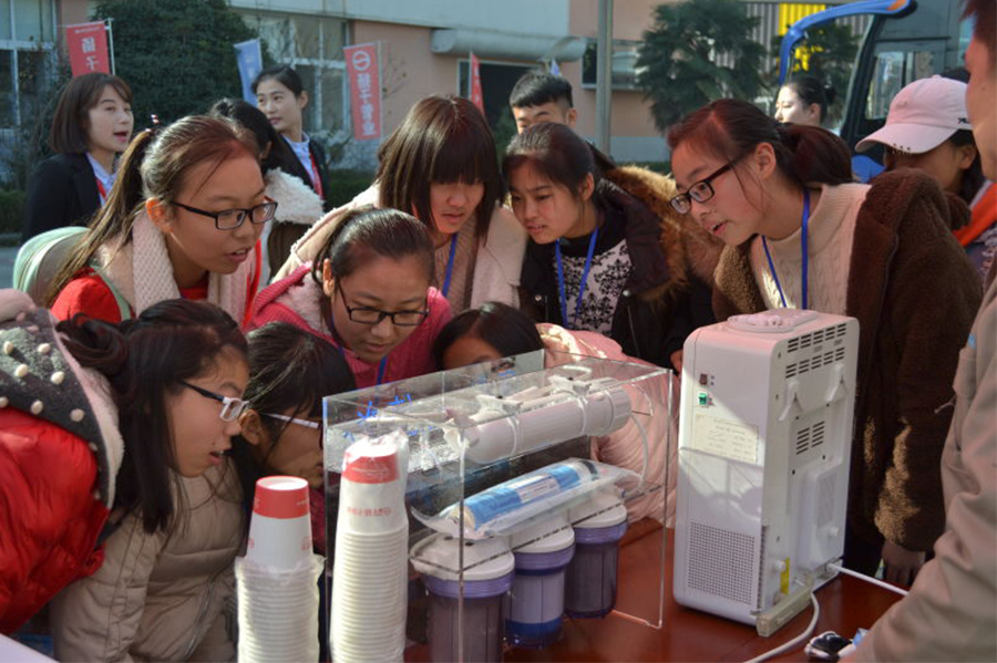 首先,我們帶領同學們學習了被污染的水是如何被凈化的,看著被黑墨水污染后的自來水通過凈水機變成純凈的飲用水,同學們紛紛圍上臺前向我們的技術員進行詢問,同學們在生產車間觀看到了如何從一個個小零件組裝成可以凈化水的凈水機。