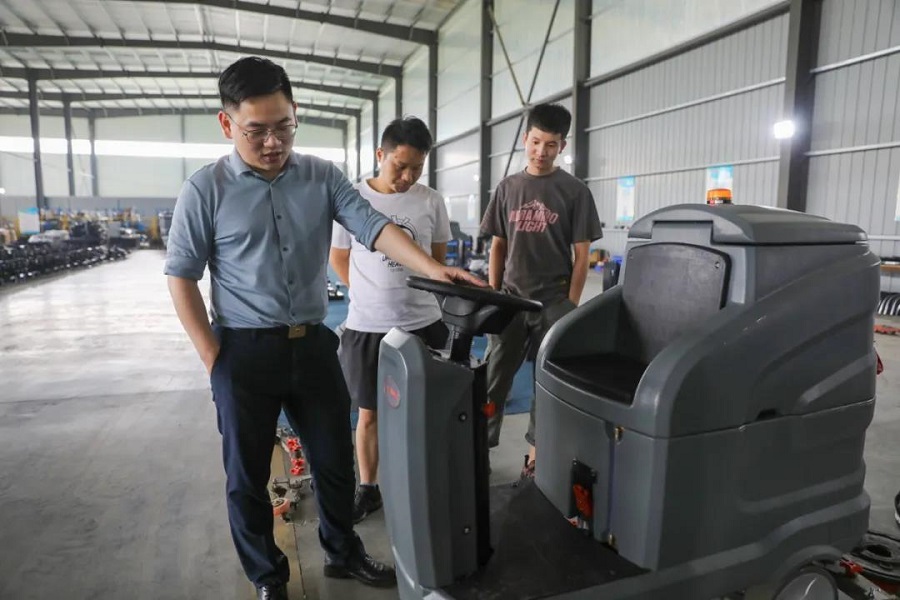 為響應國家提倡綠色,環(huán)保、節(jié)能的人類生活新標,順應市場發(fā)展的趨勢,安徽揚子工業(yè)科技有限公司應運而生。2017年,以中國揚子集團雄厚的資金實力為基礎,揚子工業(yè)滁州工業(yè)品生產基地建成,如同揚子工業(yè)創(chuàng)立時的初心,營造綠色環(huán)保的工業(yè)現(xiàn)代化氛圍,我們這次來到的廠區(qū)亦是綠草如茵、環(huán)境宜人。走進廠房,工人在操作著機器清洗地面,裝配區(qū)的工人專業(yè)而嫻熟地組裝著機器,各種工業(yè)用掃地機、洗地機等清潔設備“整裝待發(fā)”等待被運往全國各地。