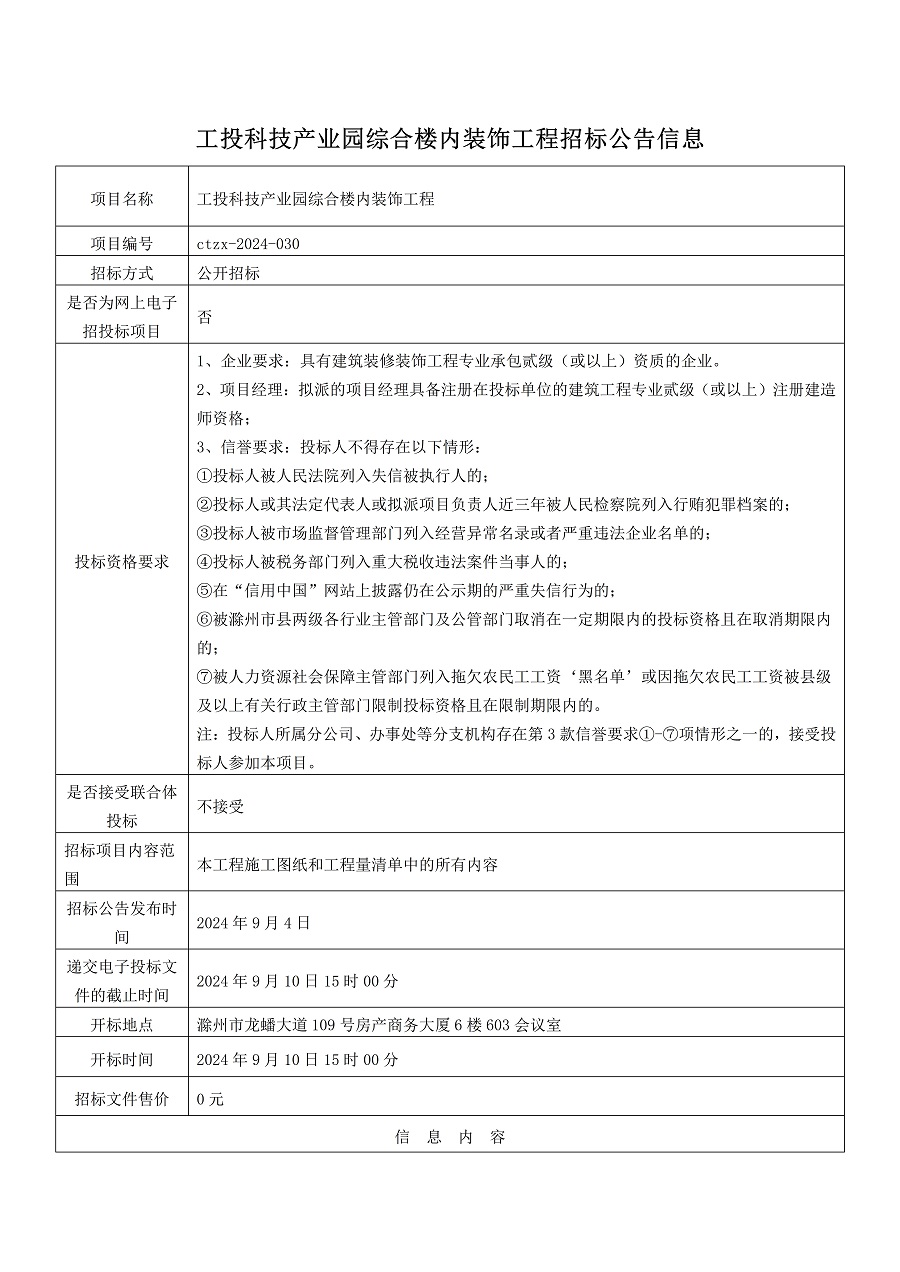工投科技產業園綜合樓內裝飾工程招標公告信息