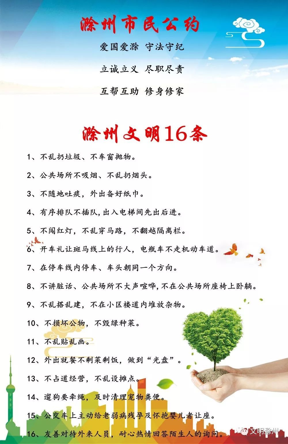 滁州市文明16條 1.不亂扔垃圾、不車窗拋物。 2.公共場所不吸煙、不亂扔煙頭。 3不隨地吐痰,外出備好紙巾。 4有序排隊不插隊,出入電梯間先出后進。 5.不闖紅燈,不亂穿馬路,不翻